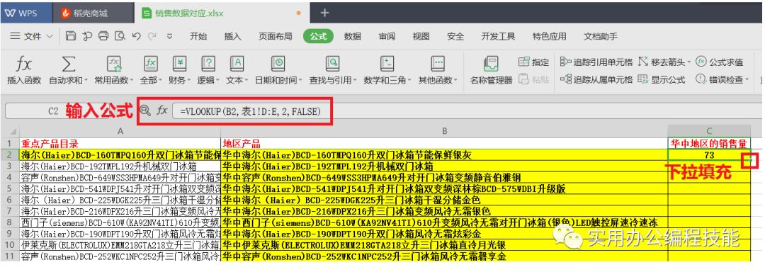 第三步:通过插入VLOOKUP函数,从表1对应出表2中重点产品目录中华中地区的销售量。第2行输入公式:VLOOKUP(B2,表1!D:E,2,FALSE),然后下拉填充。如下图: