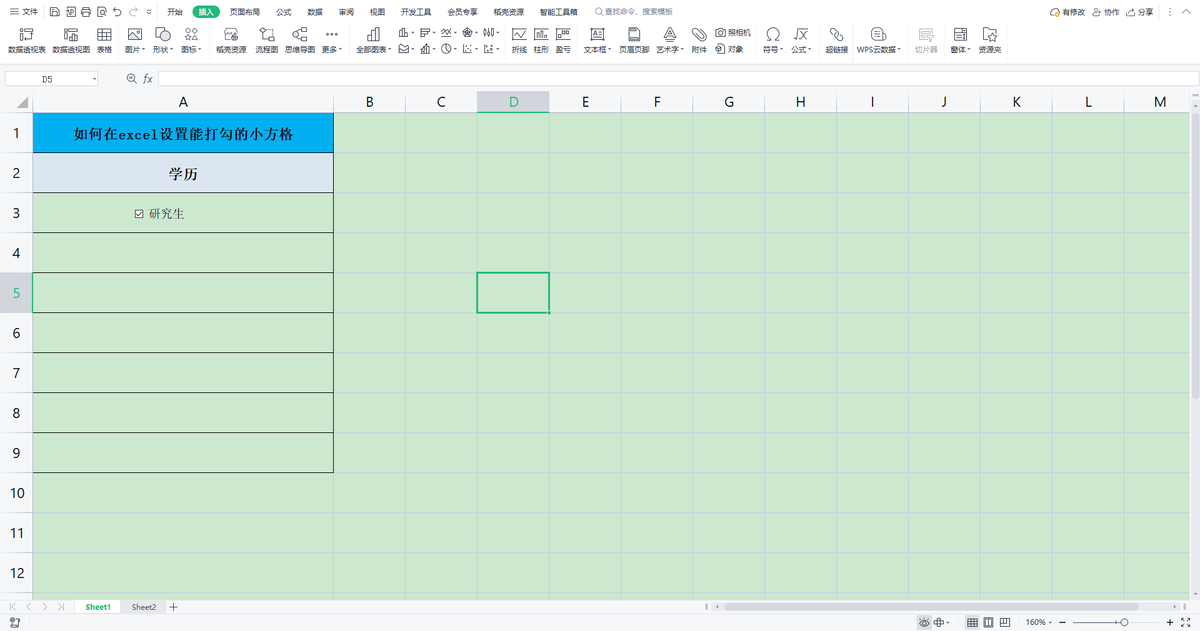 4、这时鼠标就会变成“十字架”的形状,我们在需要设置小方格的单元格中,用鼠标点击,就可以看到小方格已经设置在单元格中了,我们再将鼠标放至小方格上方,鼠标右键,就可以编辑小方格后面的文字了,这里我们填入学历名称“研究生”,填入完后,我们再通过鼠标调整好小方格的位置,最后鼠标随意点击其他任意空白单元格就可以了。