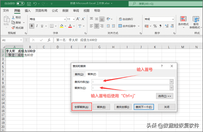 如果想要进行一定数量的换行的话,我们可以使用批量换行功能。选中需要换行的单元格后用“Ctrl+H”唤醒“查找和替换”功能;在里面输入“:”(符号根据自身内容实际输入),符号以内容中的实际已有符号为准。最后点击“全部替换”即可!