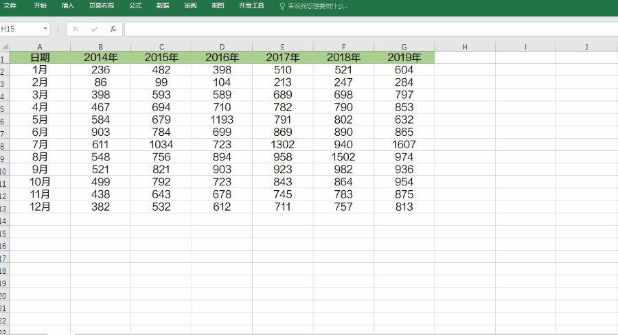 把次年的数据依次往下拖动,每年的数据之间,都相隔一行,然后把月份在A列复制粘贴,直至最后一行。