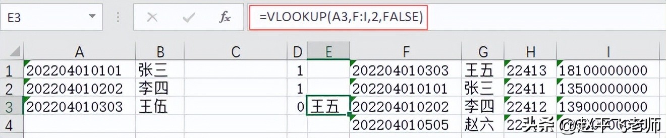 我们发现D3单元格显示为0,说明本次信息收集上来的该生的姓名有误。我们可以通过在E3单元格输入第一个函数=VLOOKUP(A3,F:I,2,FALSE),查看到学籍信息中,该生的姓名为王五,而我们本次报名活动收集到该生的姓名为王伍,多了一个单人旁,需要改成正确的姓名。