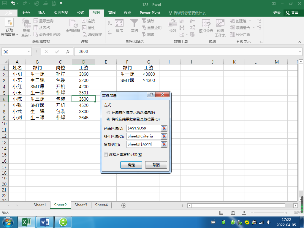 举例1:把生一课员工工资大于3600的筛选出来。(一个条件)
