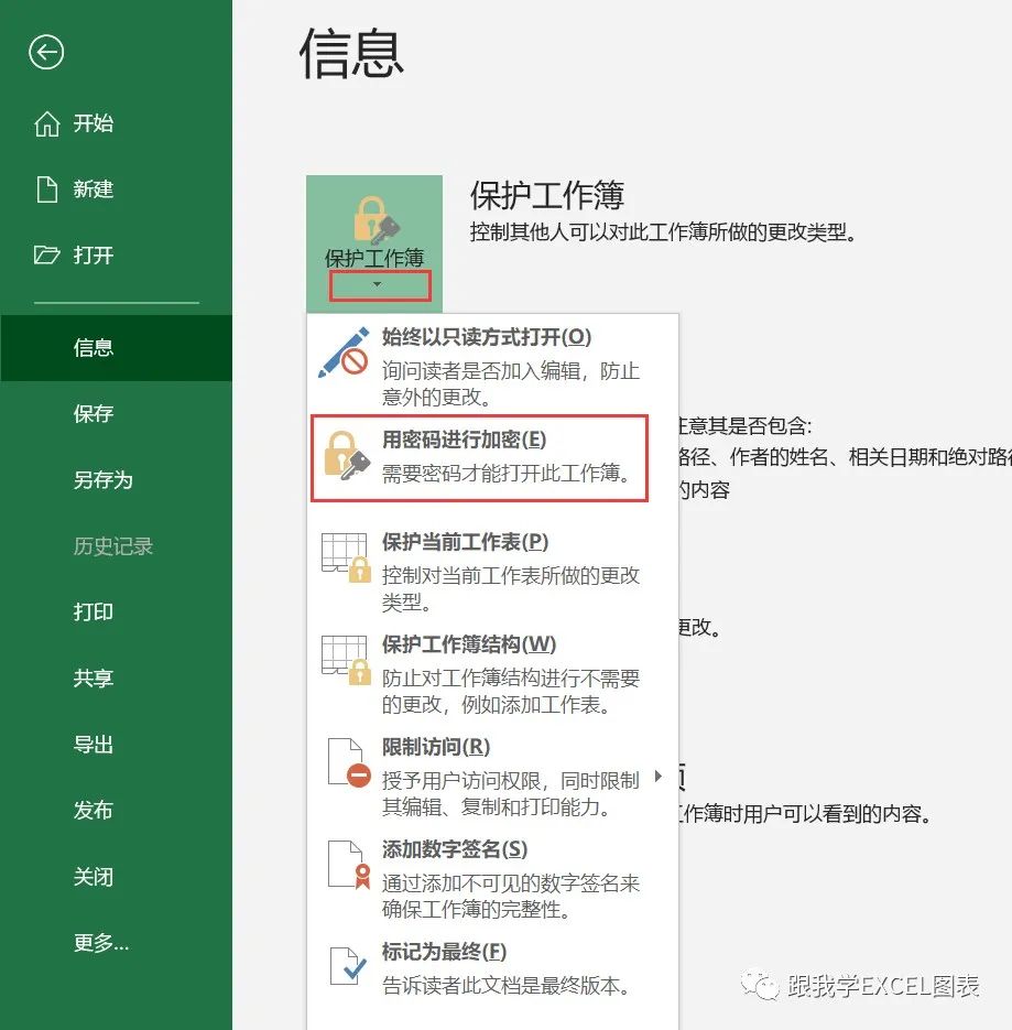 然后选择信息-保护工作簿,如下图所示,我们看到一个带锁和钥匙的图标。