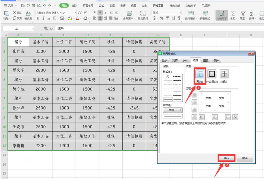 选中所有带有边框的单元格,点击工具栏上的【开始】选项,在下拉菜单中选择【边框】,二级菜单选择【无框线】: