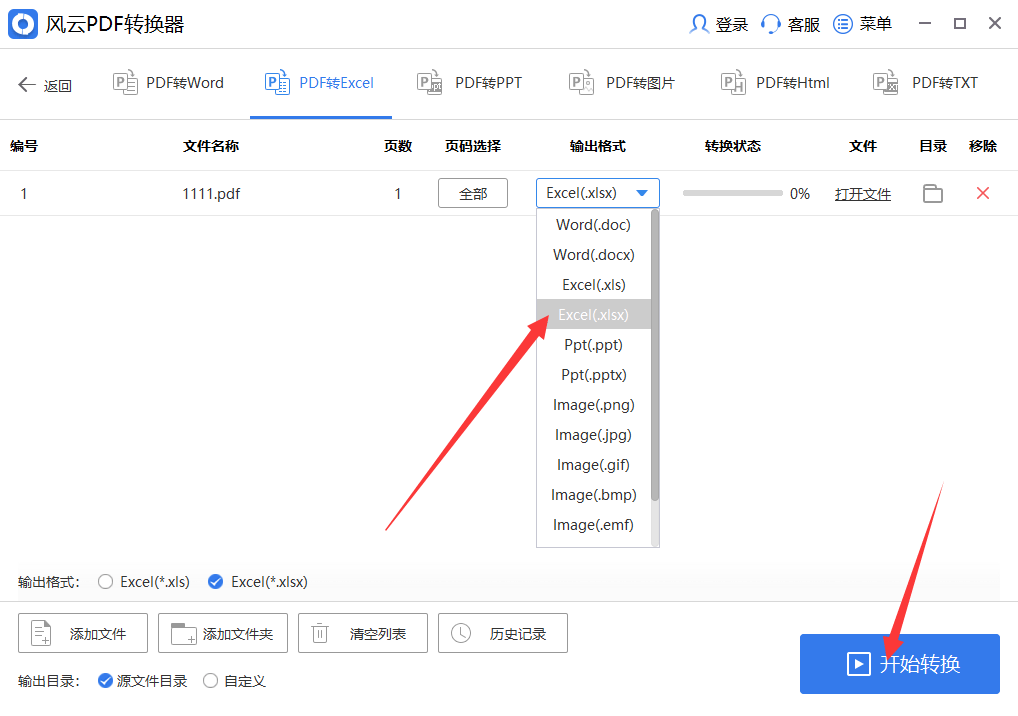 上传好了之后,我们首先需要在输出格式中找到我们想要转换的excel表格的格式,选择好了之后我们就可以点击开始转换来进行转换了