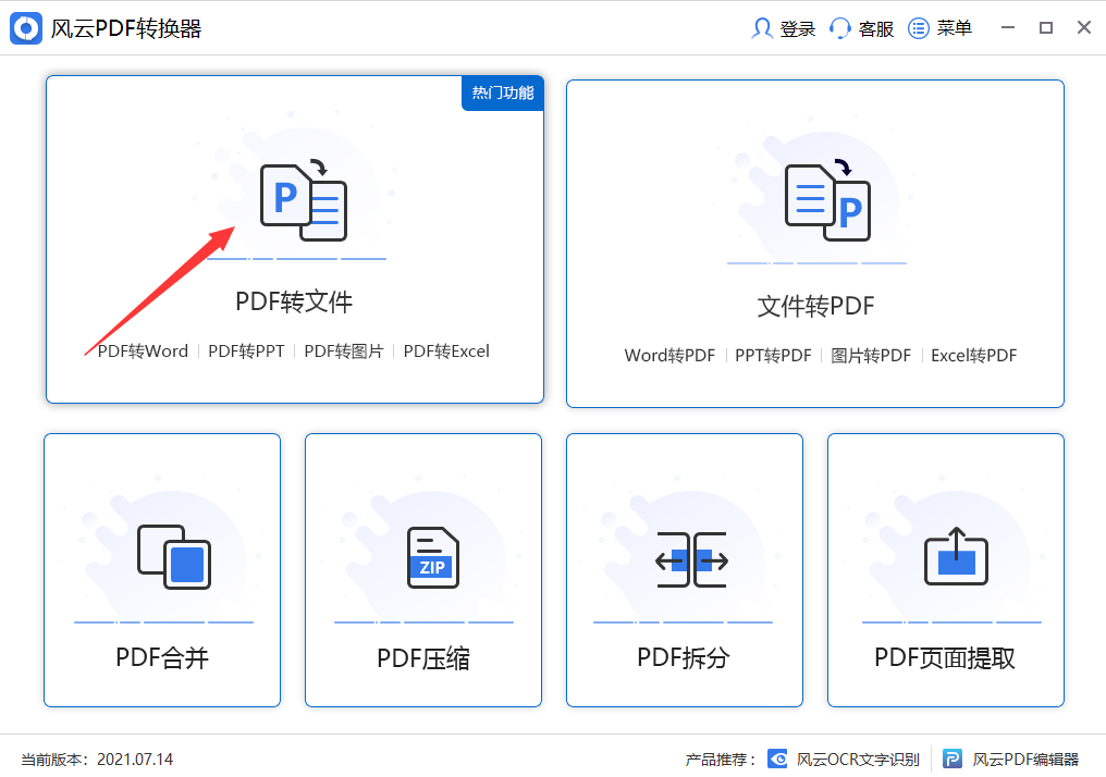 我们要想使用风云PDF转换器这款软件来进行转换的话就需要我们先下载这款软件,然后安装到我们的电脑上,安装好了之后就直接打开,并在软件的主界面中需要我们找到PDF转文件这个功能