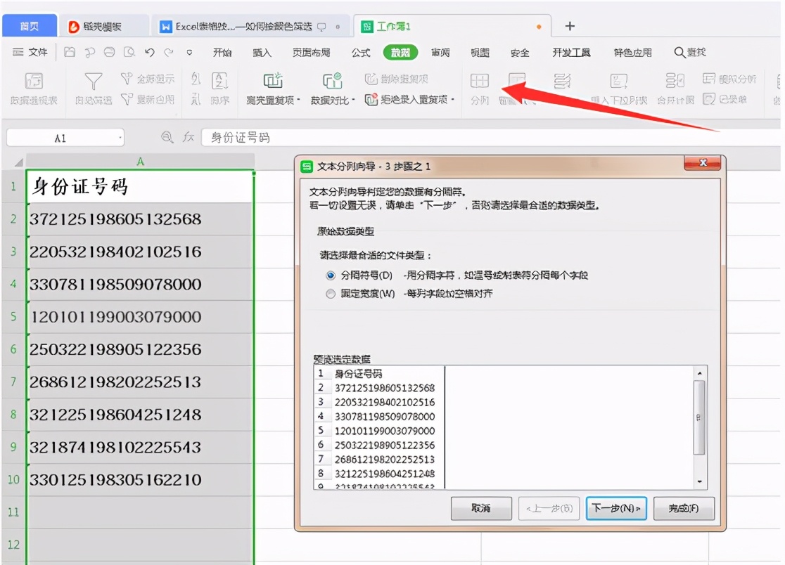 将身份证一列选中,选择菜单栏数据选项,点击分列,就会跳出如下的对话框: