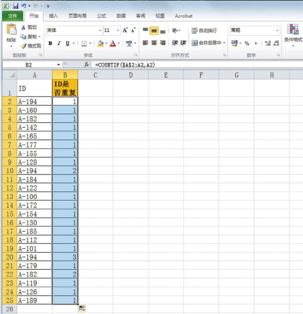 若结果显示为2,说明 A 列中存在与单元格 A2有相同值的单元格,可以得知数据有重复。