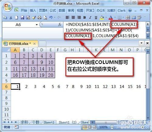 此法是第三、四种方法的逆方法,如下图,要将单列数据变成4行5列的表格,在C1输入公式:=INDEX($A$1:$A$20,(ROW(A1)-1)*5+COLUMN(A1)),右拉5列,下拉4行公式即可完成行列的转换。