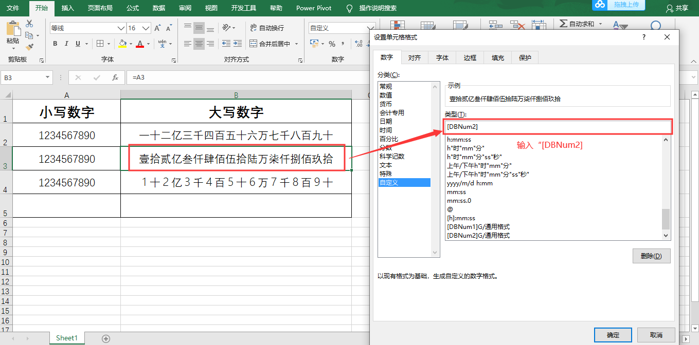 "数字"标签中选中"分类"列表框中的"自定义",然后在右侧的"类型"中输入"[DBNum1]"