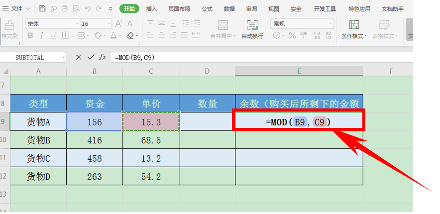 然后在表格当中,输入公式=MOD(B9,C9),即资金与单价: