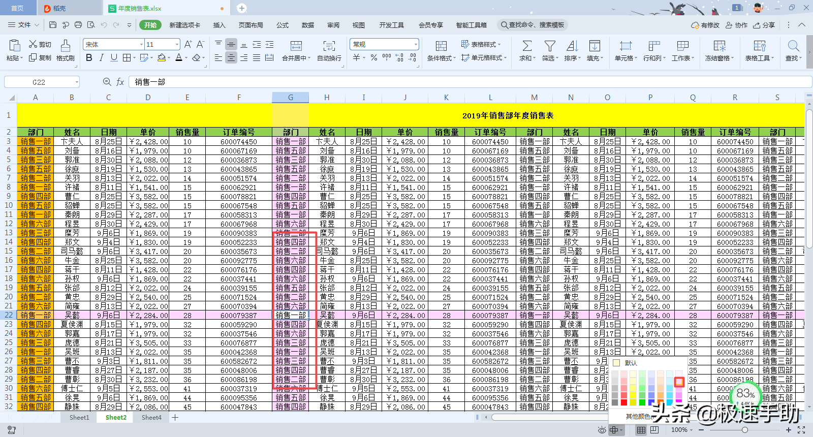 第六步,这样我们在选中单元格时,该单元格和其所对应的列和行的单元格就都会以这个新颜色来标注了。