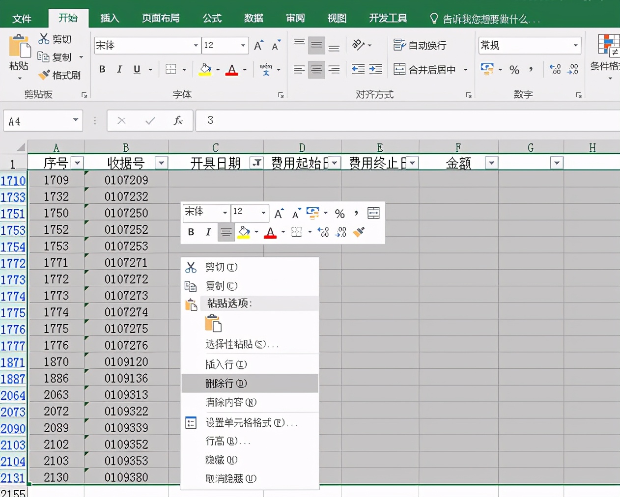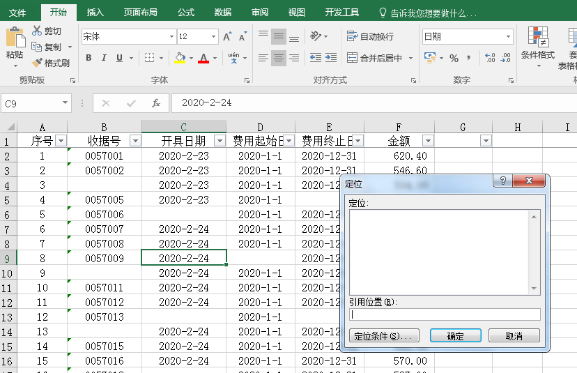 下图是一张收据收费统计表,有很多没有数据的行,那是作废的收据,我们该如何删除这些作废收据的行呢?