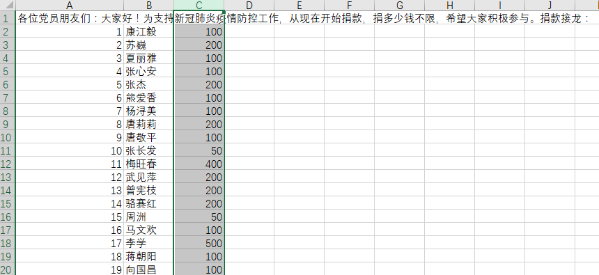 1)将微信中的捐款清单复制到EXCEL中,复制过来后会发现数据集中在A列。