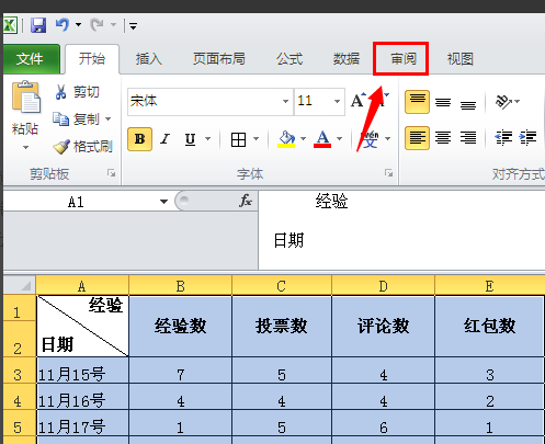 4,接着回到excel表格中,再点击表格上面主菜单中的“审阅”菜单。(如下图)