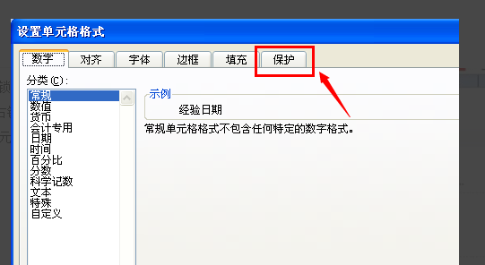 2,接着来到设置单元格格式下的“数字”属性中,点击上面主菜单中的“保护”功能菜单。(如下图)