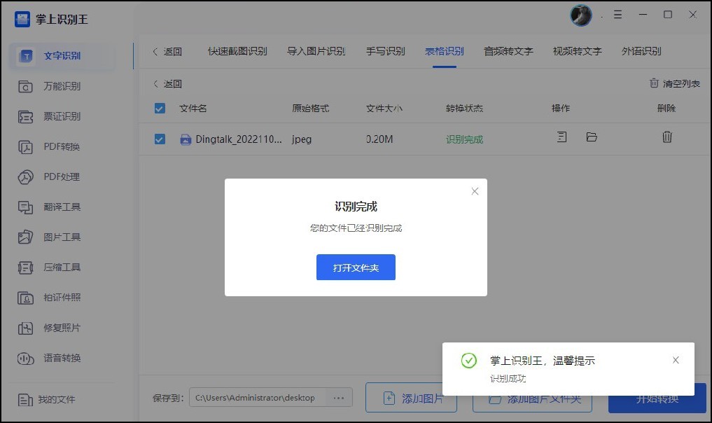 点击开始识别之后,稍等片刻,软件就会提示识别成功。