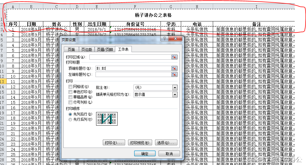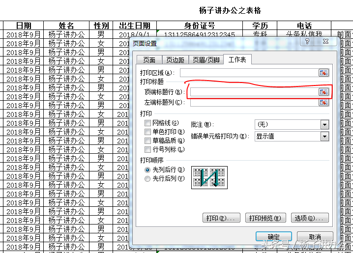 鼠标移动到在”顶端标题行“后面空白区域,或者顶端标题行最后红色箭头按钮。在EXCEL中此图标为选择区域图标。之后把鼠标移动在最左端行数数字标题处,这时鼠标会变成黑色向右的箭头,点击选中第一行和第二行(标题几行就选择几行)。之后点击确定即可。也可单独选择第二行,这样的效果是除第一页有”杨子办公之表格“标题外,第二页和之后每一页的开始都是第一页第二列的标题。这样的话可以稍微节约打印纸张。