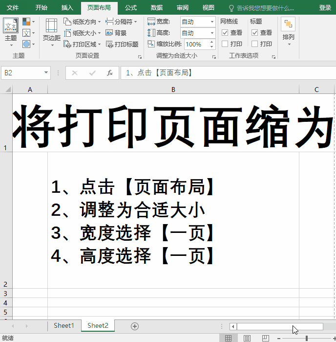 有时候表格太长,明明可以一页打印,打印出来却是两张纸。慢慢的调整字号和行距?那也太麻烦了。我们可以点击【页面布局】中,选择宽度【1页】,高度【1页】,就自动调成一页,打印出来就是一页啦~