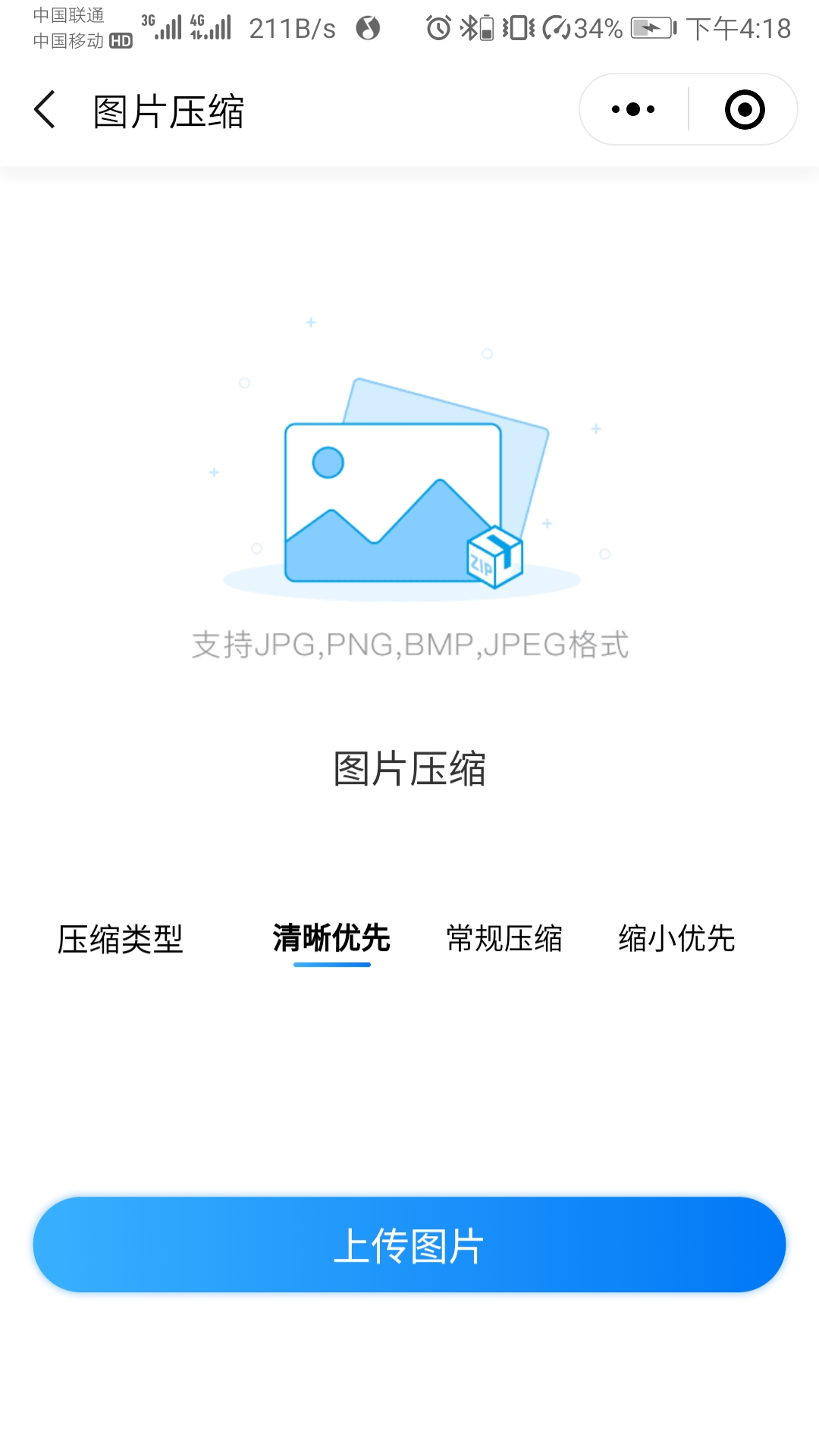 如果你的文件是在手机端的话,那么也可以使用迅捷压缩这个小程序,同样可以对图片进行快速压缩的呢,而且也不用下载任何的软件,需要用的时候直接在微信聊天界面下拉后就可以快速打开了呢。