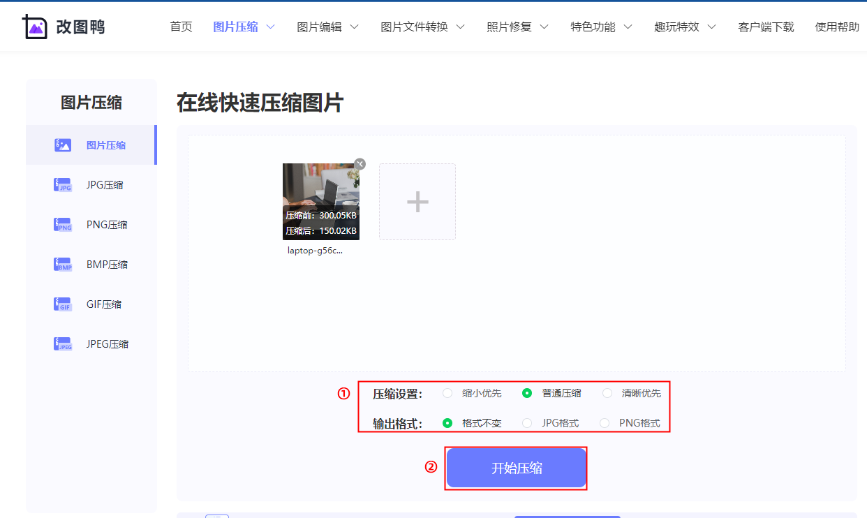 打开改图鸭网站,点击“图片压缩”进入操作页面。接着上传图片,勾选对应的压缩设置和输出格式,点击“立即压缩”,等待图片压缩成功即可。
