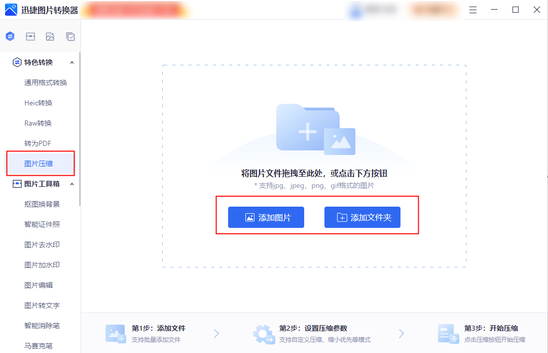 第一步:打开电脑软件,点击“图片压缩”功能,添加需要压缩的图片文件。