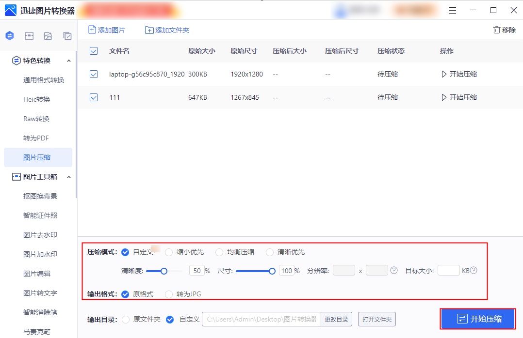 这款迅捷图片转换器软件的功能有很多,不仅支持jpg转png、heic转jpg、raw转jpg等多种格式转换功能,还提供了图片压缩、抠图换背景、照片修复、图片编辑等图片处理功能。并且它的很多功能支持批量图片文件处理。如果大家手头有很多图片需要压缩的话,就可以使用该软件来操作,压缩后的图片会保留原图的清晰度。