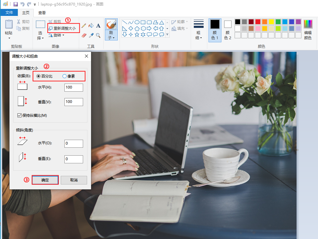 使用画图工具打开图片,接着在工具栏找到“重新调整大小”,在弹出的页面中,调整“百分比”和“像素”两项参数设置,,最后点击“确定”,并保存图片就可以了。