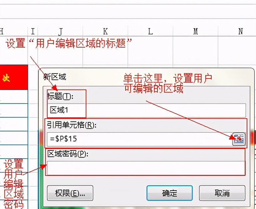 第六步:选择好“允许用户编辑的区域”后,单击“确定”返回“允许用户编辑区域”对话框。然后再单击“保护工作表”