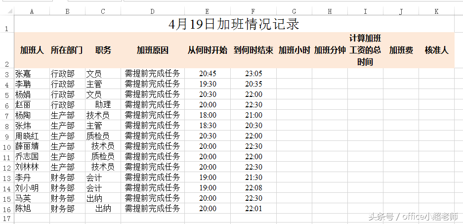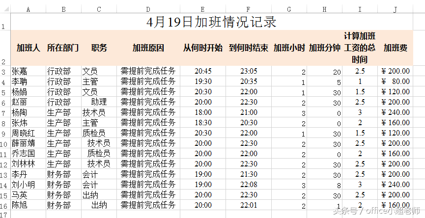 当工作中如果需要汇总加班情况,计算加班费用,我们可以借助于excel中的时间函数来解决。比如在下面的表中汇总计算加班时间以及加班费用。
