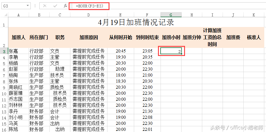 那么我们首先借助于时间函数hour()、minute()函数计算出加班的小时和分钟