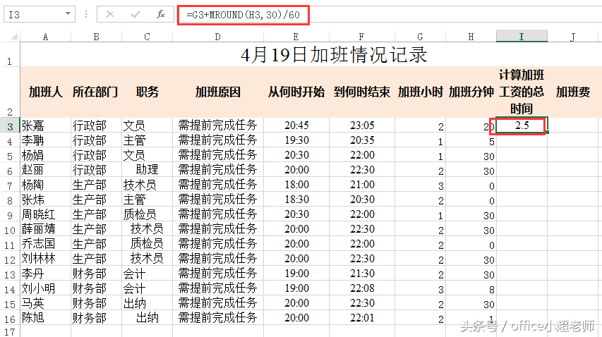 所以,在这里我们借助于mround()函数来解决加班分钟,此函数用于返回一个舍入到所需倍数的数字。