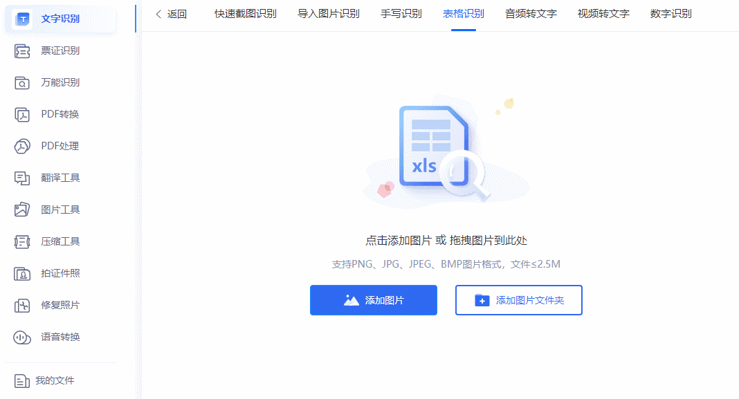 2、上传需要识别的图片,这里支持png、jpg、jpeg等多种格式,同时还支持直接添加文件夹,一次识别多个表格!简直就是懒人福音,识别的速度也很快,识别的结果会在桌面自动生成一个文件