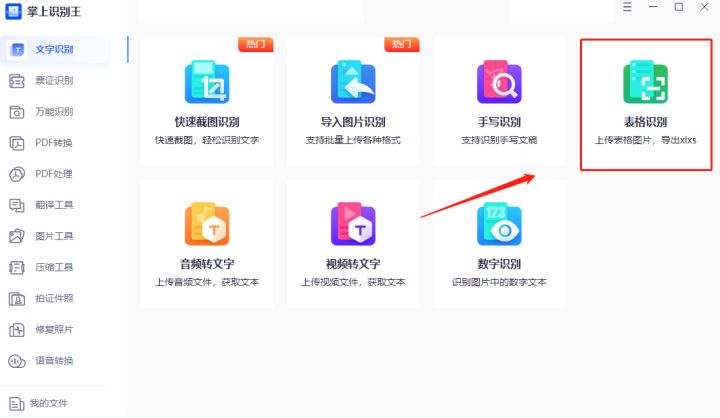 1、打开软件,各个功能排列的都很整齐,一目了然,首先先找到表格识别的功能