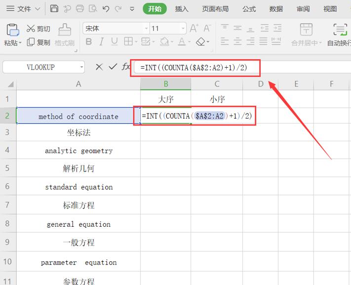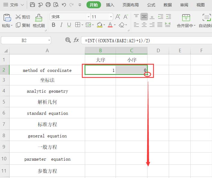 我们在B1填入【大序】,在C1填入【小序】,然后在B2处输入公式【=INT((COUNTA($A$2:A2)+1)/2)】;