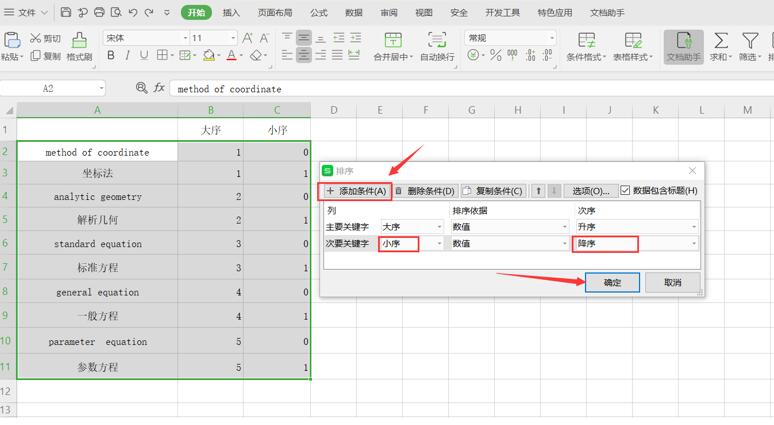 然后点击【添加条件】,次要关键字选择【小序】,次序选择【降序】;