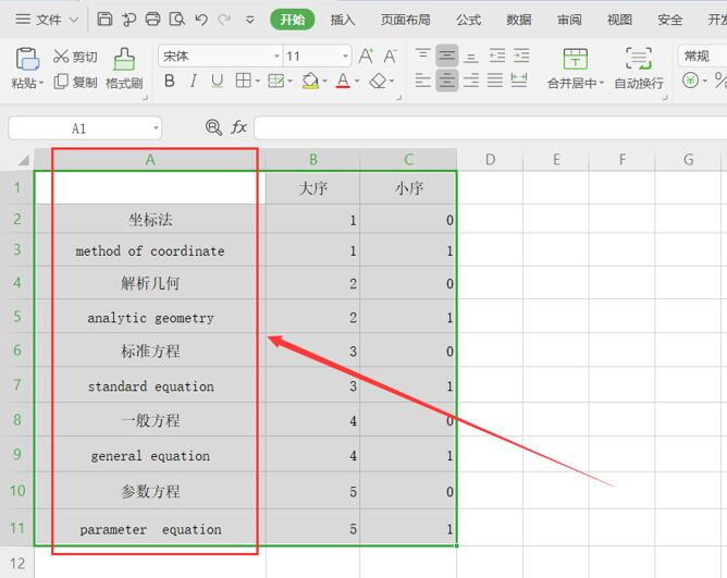 首先,我们这个表格有中英文,上一行是英文,下一行是中文,依次类推,那么下面我们就来操作将行的顺序颠倒,使上一行调换为中文,下一行调换为英文;