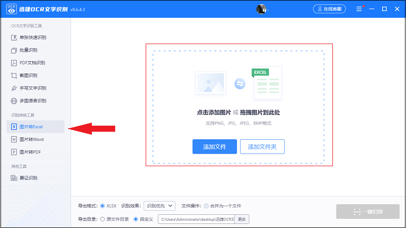 步骤一:首先我们在电脑上打开迅捷OCR文字识别工具,进入操作首页,然后在识别转换工具下面点击图片转excel功能,接着点击添加图片或者添加文件夹添加图片。