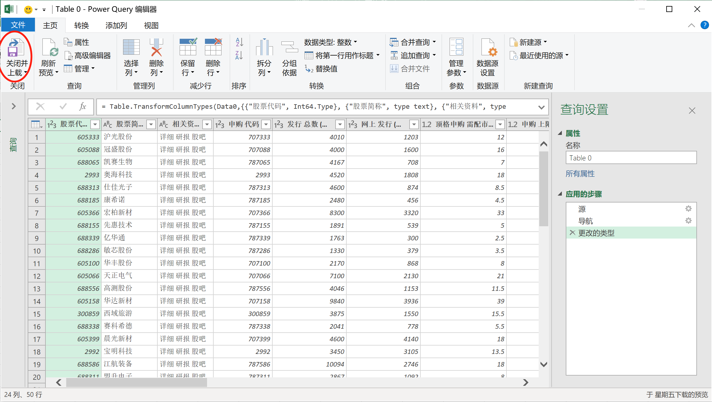 点击右下角的 转换数据,就可以进入到Power Query编辑器了。Power Query编辑器是一个进行数据清洗的强大工具,在数据爬取的过程中,会有可能出现乱七八糟的数据,这时候就需要数据清洗,关于Power Query编辑器的使用后续我会写一下教程,这里就不展开了,我们这次爬取的数据比较干净,不需要清洗,所以直接点击左上角 关闭并上载即可 ,就能把数据传到excel中了。