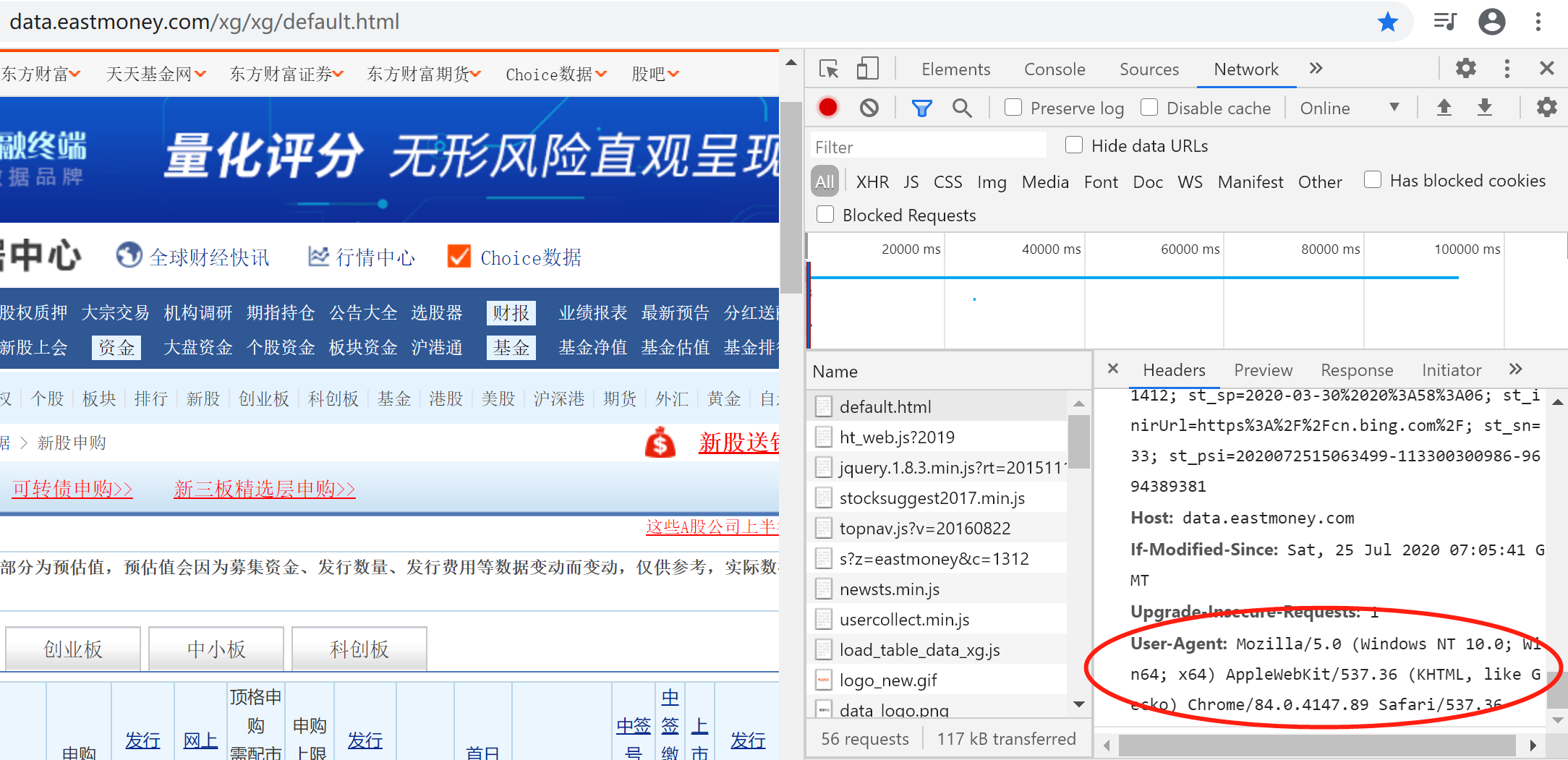 (3)点击上图中的 default.html 按钮,将页面拉至最下面即可找到UserAgent啦,将User-Agent冒号后面的文字全部复制,如括号中所示,因为我用的谷歌浏览器,这就是谷歌浏览器的UserAgent。(Mozilla/5.0 (Windows NT 10.0; Win64; x64) AppleWebKit/537.36 (KHTML, like Gecko) Chrome/84.0.4147.89 Safari/537.36)