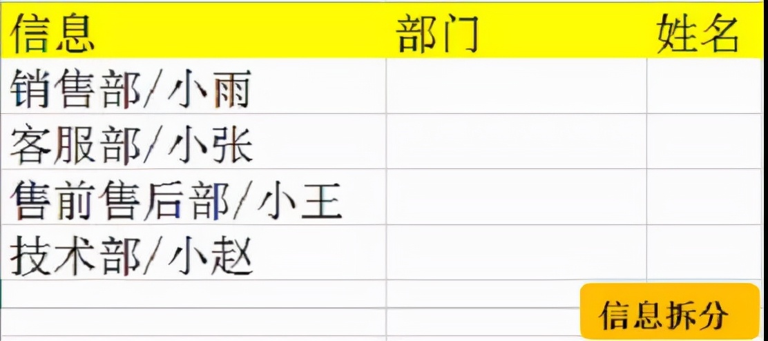 下面这个表格中,我们需要将第一列的信息,拆分成两列,部门和姓名。同理,用普通的方法,excel的分列功能就能够完成目标,但是依旧是过程太繁琐,很多人都没有用过分列功能。