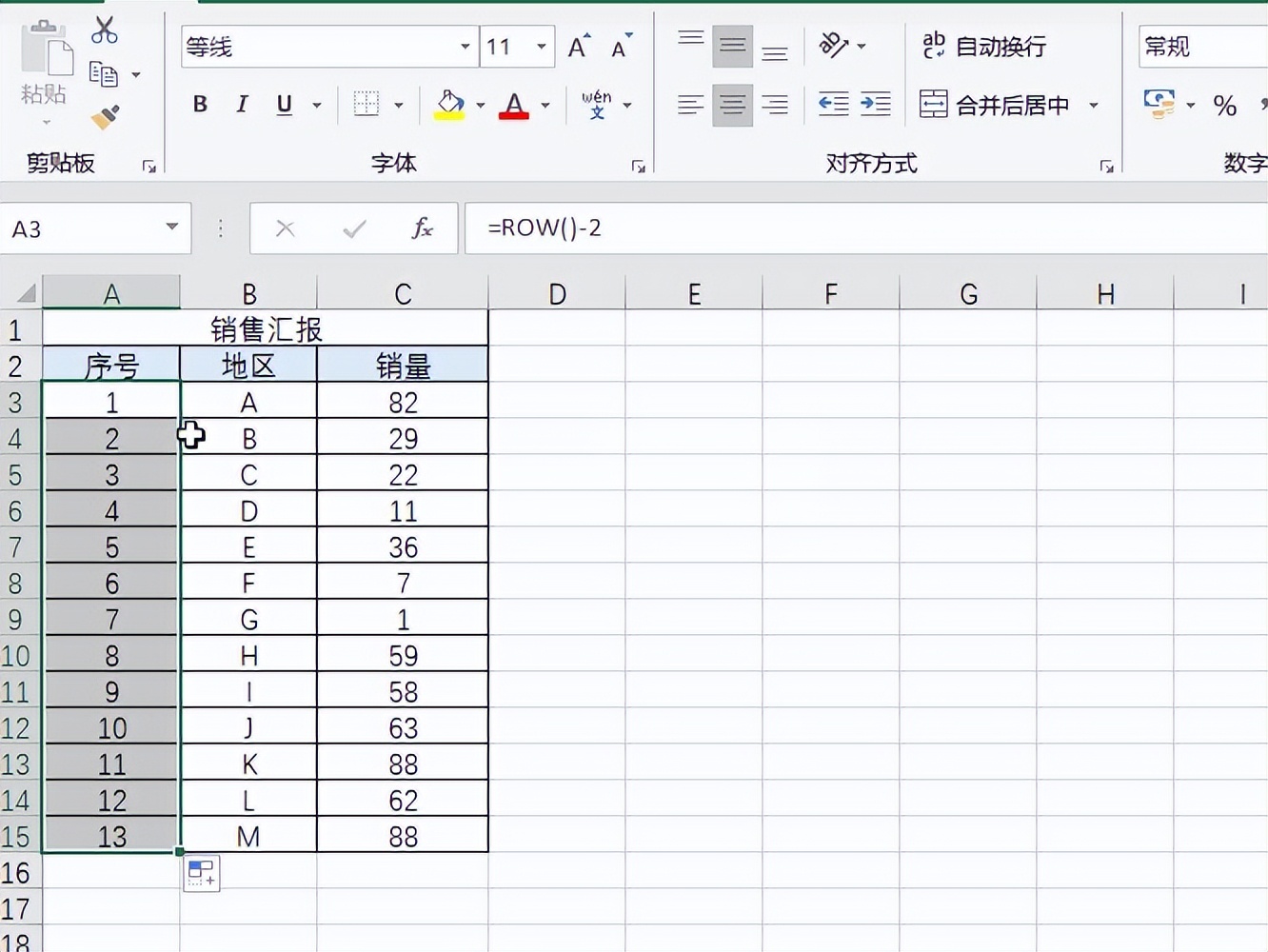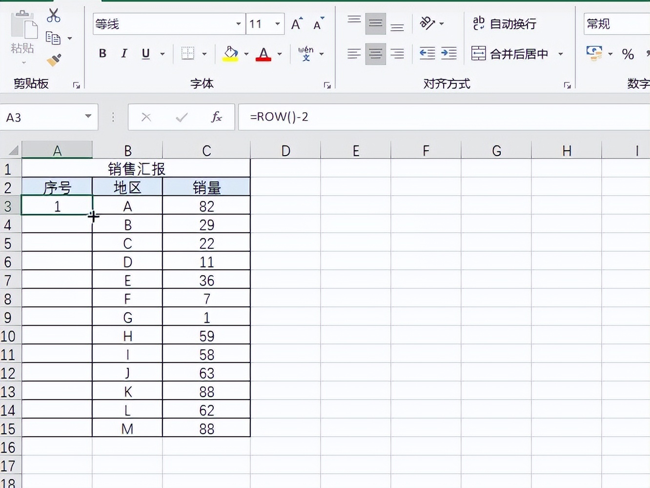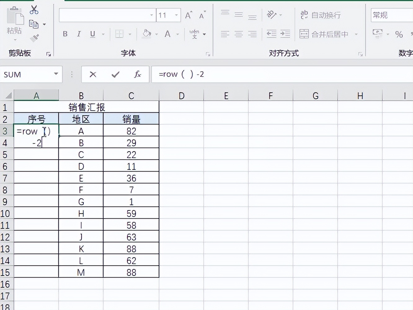 3.确定后即可得到第一个序号,注意row函数返回的是当前行,为了得到1它是要减去相应的数值的