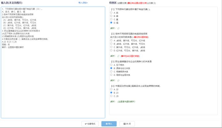 点击题库的【批量新增】按钮,弹出对话框。左侧为输入区,可以把Word中的题目复制粘贴在这里,那么右侧检查区会自动格式化识别题目,并把警告项列出,比如未设置答案等。