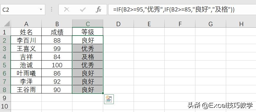 在单元格中输入公式=IF(B2>=95,"优秀",IF(B2>=85,"良好","及格")),向下填充即可。