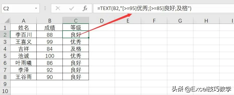 和单元格格式的自定义设置一样,TEXT函数支持条件区段格式,可以在单元格中输入公式=TEXT(B2,"[>=95]优秀;[>=85]良好;及格")