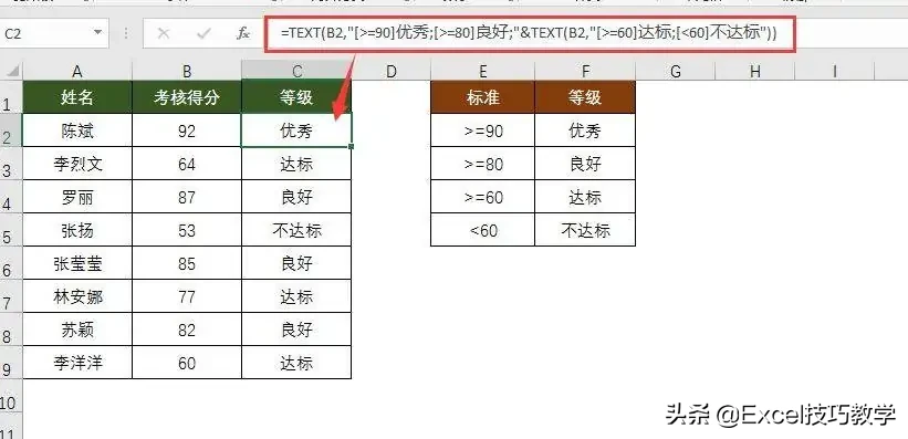 输入公式:=TEXT(B2,"[>=90]优秀;[>=80]良好;"&TEXT(B2,"[>=60]达标;[<60]不达标"))