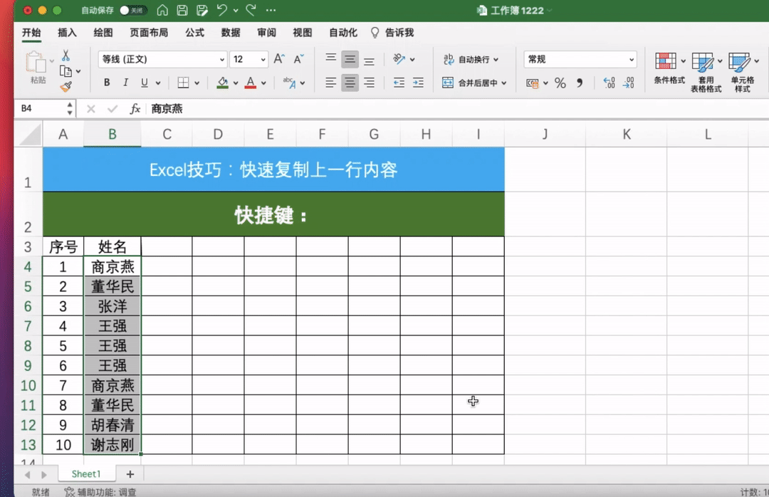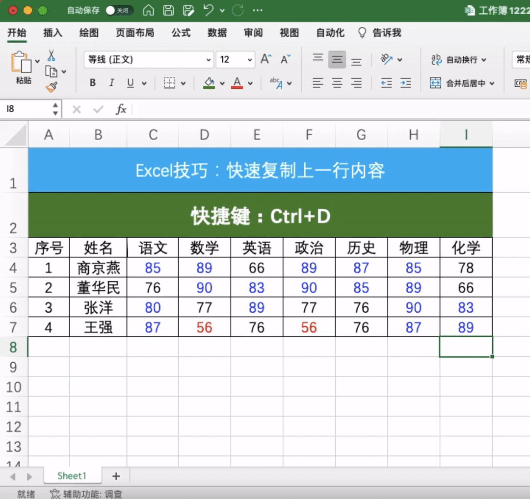 先选中一行空白行,按Ctrl+D键完成快速复制上一行内容。
