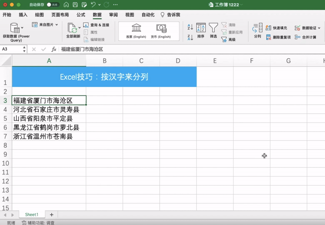 将籍贯按省市来分列。Excel中的分列还可以使用汉字作为分隔符。