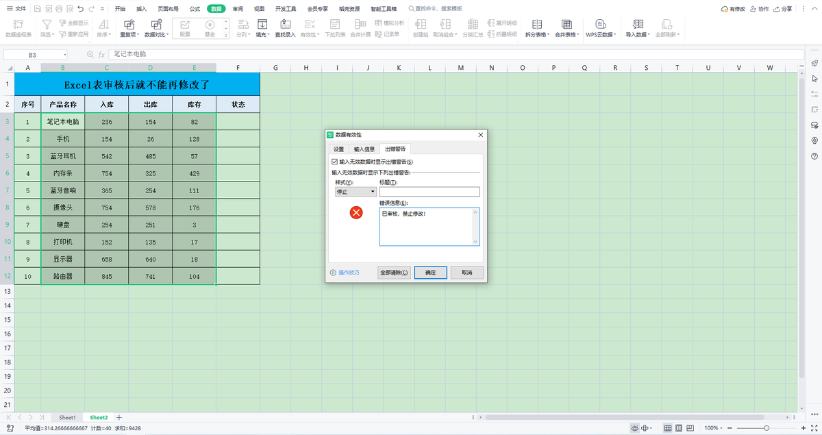 6、然后再选择对话框中的“出错警告”,样式中选择“停止”,最后在错误信息输入框中输入“已审核,禁止修改”,再点击“确定”按钮,这样我们设置好了审核后的数据就不能再修改了;