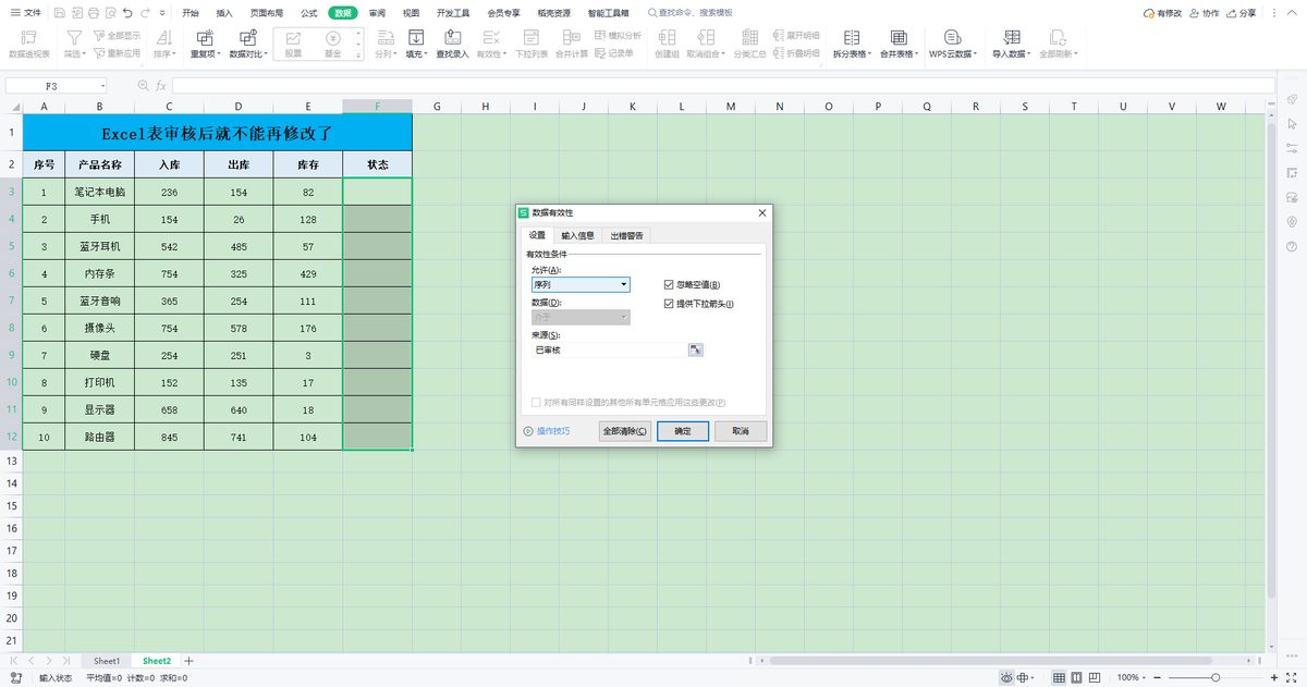 3、弹出“有效性”对话框后,在有效性条件下的“允许”选项中,选择“序列”,来源输入框中输入“已审核”,再点击“确定”按钮,状态列我们就设置好了下拉选项了;
